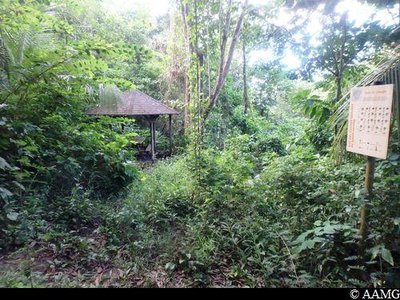 A sign with karbays on either side shows a plan of the garden (now covered with vegetation).