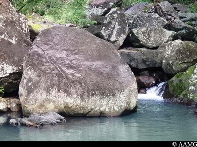 Close by the previous rock point (5 metres downstream), you will see this rock, which is remarkable for the quality of the engravings. You have to go round it to see the drawings because the engraved side is facing downstream. There is an attractive pool just in front.