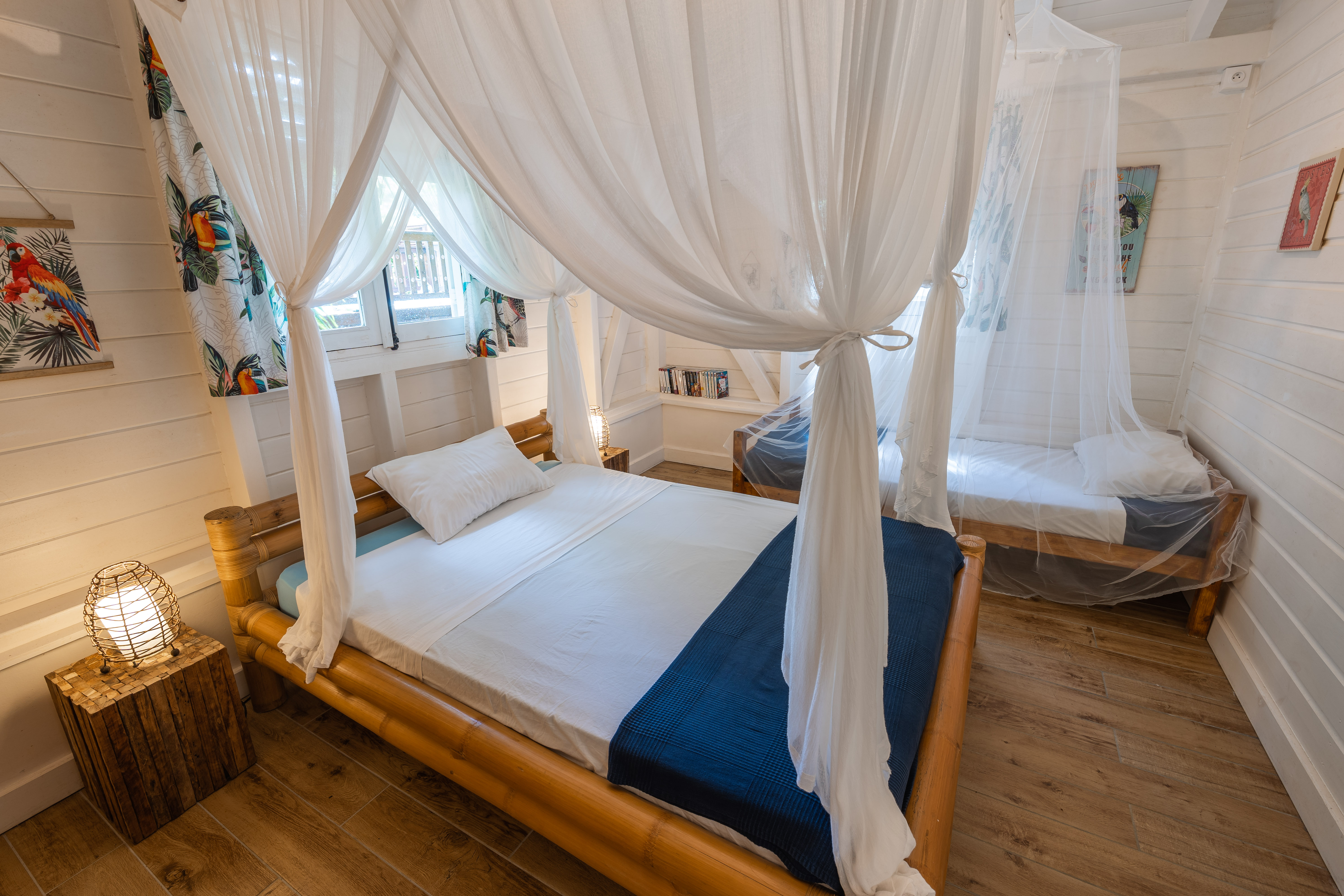 Dormez au rythme de la nature La grande chambre parentale, dotée d’un élégant lit à baldaquin et d’une moustiquaire en coton, s’ouvre sur une douche tropicale inspirée par la nature environnante : démarrez chaque journée avec l’énergie des premiers rayons de soleil et le doux murmure du jardin. La seconde chambre, également climatisée, propose un lit double et un lit simple, tous deux enveloppés de moustiquaires qui garantissent des nuits paisibles.
