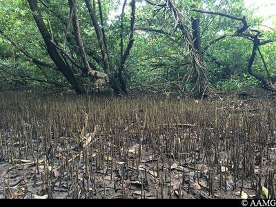 Racines de Palétuvier Blanc ou Noir. Ces racines permettent aux arbres de pouvoir respirer dans ce sol trés asphyxiant. Elles agissent comme des tubas de plongeur. Leur hauteur nous indique à quel niveau l'eau peut monter lors des inondations.