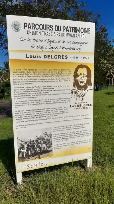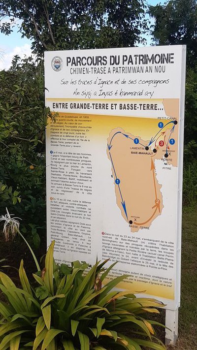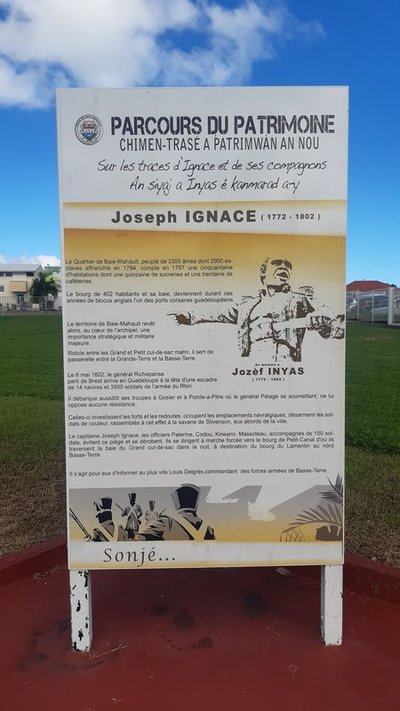 "Ce parcours du patrimoine est consacré au passage de Joseph IGNACE et des ses compagnons sur le territoire. Il matérialise de manière symbolique une partie de l'itinéraire emprunté par ses valeureux soldats lors de la guerre de 1802. Revenant de Basse-Terre où ils quittent Delgrès, pour se rendre à Baimbridge, ils n'ont d'autres solutions que de passer par Baie-Mahault. Le territoire de la commune a été témoin d'affrontements, de luttes et d'occupations pour la libération de la Guadeloupe. Bien plus que de tracer une route exacte, il s'agit d'éclairer la place du territoire de Baie-Mhault dans cette épopée." Chantal Lauriette, Directrice des Affaires Culturelles et du Patrimoine à la ville de Baie-Mahault.